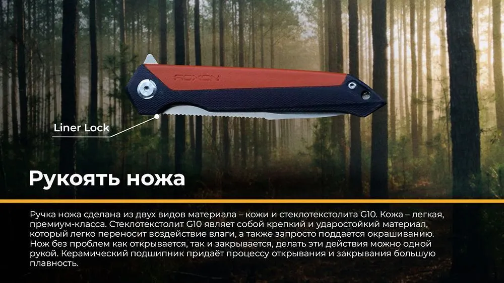 Нож без проблем как открывается, так и закрывается, делать эти действия можно одной рукой. Керамический подшипник придаёт процессу открывания и закрывания большую плавность. Замок разновидности флиппер, безопасность эксплуатации.